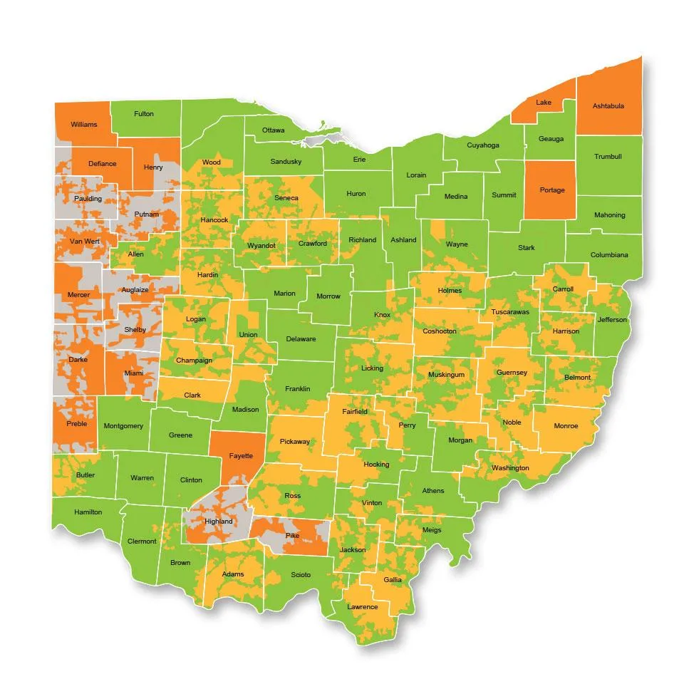Columbia Gas of Ohio provides service to the majority of Ohio serving 1.4 million people. They service areas as far west as Clark County, and on the eastern side from Trumbull County to portions of Scioto County.